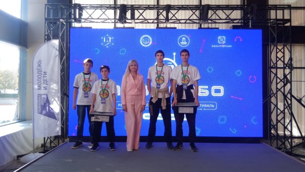 Команда Новокубанского района: Валентин Третяк, Михаил Гаппоев, Илья Павленко, Алексей Павленко и руководитель проекта «Инновационные мастерские» Евгения Морозова после церемонии награждения (фото предоставлено автором).